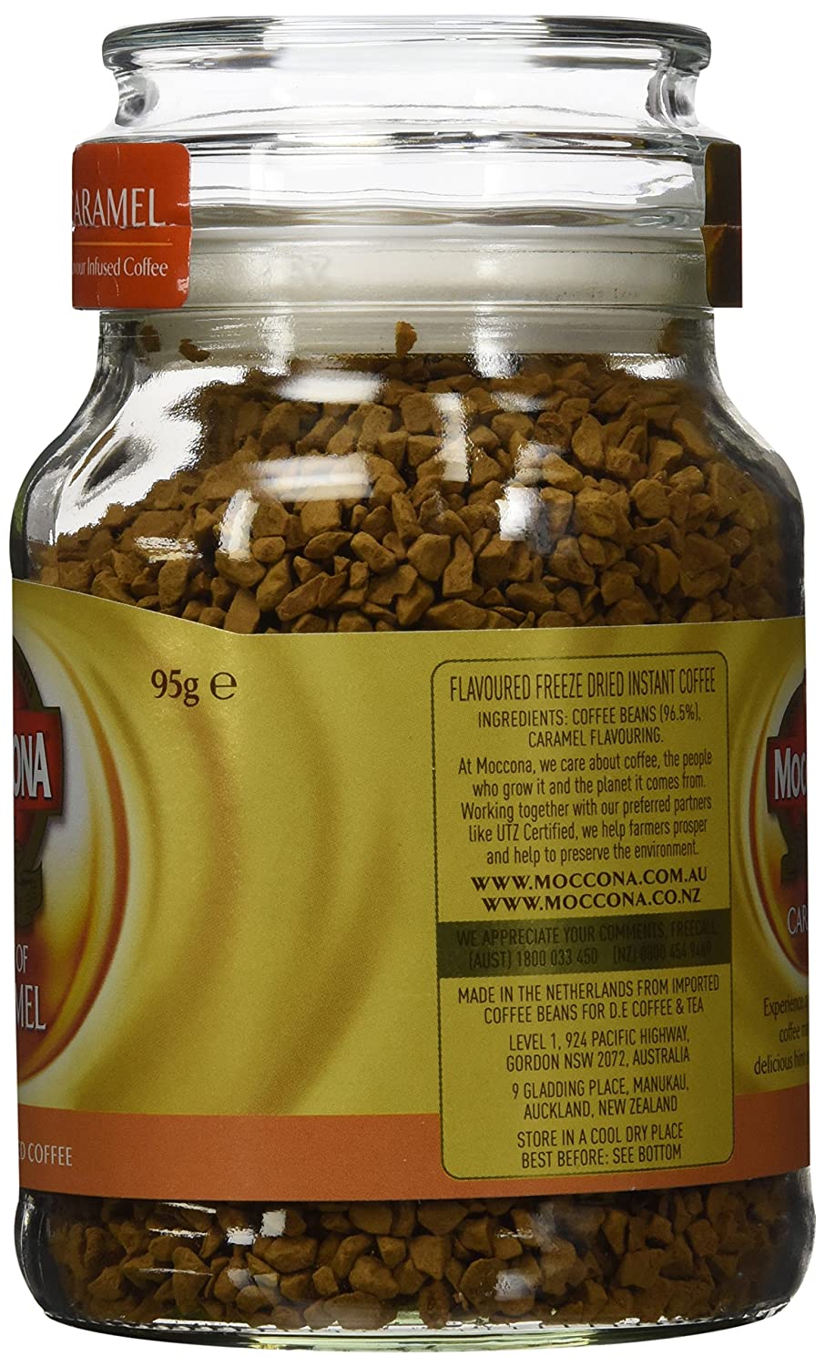 Flavor Name:Caramel Amplify your coffee moment with a caramel flavor infusion Known for its premium taste and elegant glass jar, Moccona has become a much-loved classic in homes all over Australia Experience a more indulgent moment with a delicious hint of caramel flavor Caramel flavor pops out of this sweet...